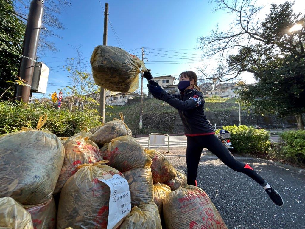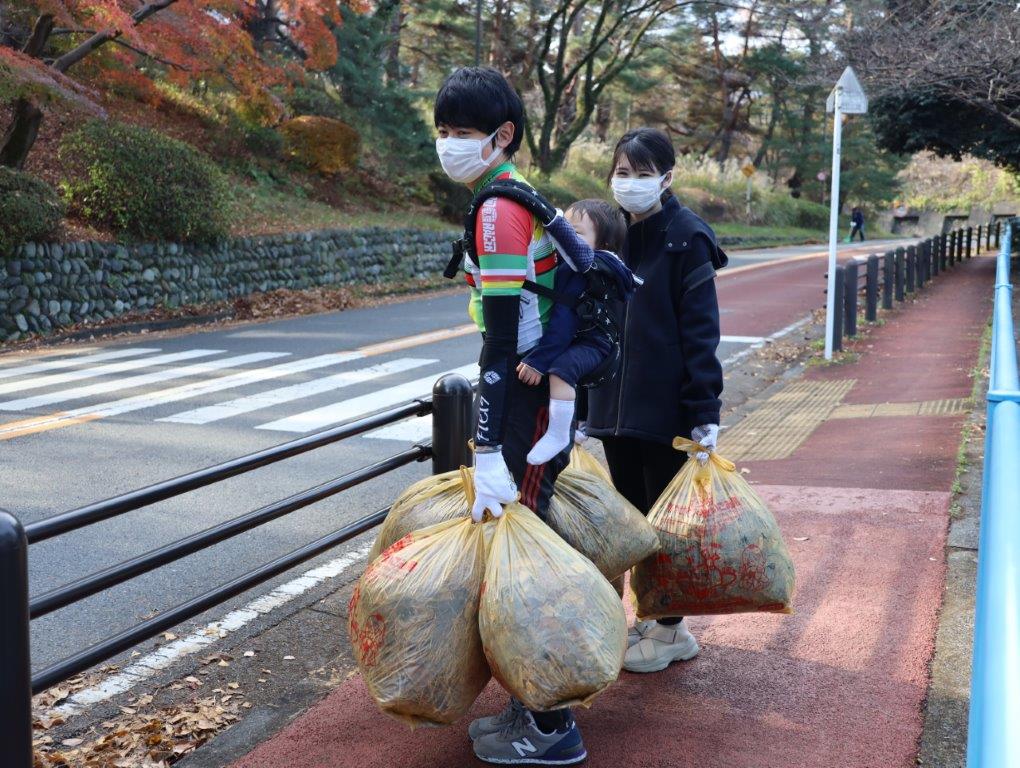 「年末いろは坂清掃」に参加したボランティアと集めた落ち葉の袋