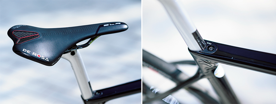 一方で、ペダリングに対してはマイルドなフィーリングを残し、レーシングバイクながらサクサクと軽快にペダルを踏み込むめる。路面のつかみはシャープでありながら、ストレスを感じさせない剛性感がライダーのパフォーマンスを素直に引き出してくれる。それが新型メラクの印象だ。そこにはデローザらしい芯が通っており、それは高速域やハイパワー域でバイクの安定した挙動を導いてくれる。