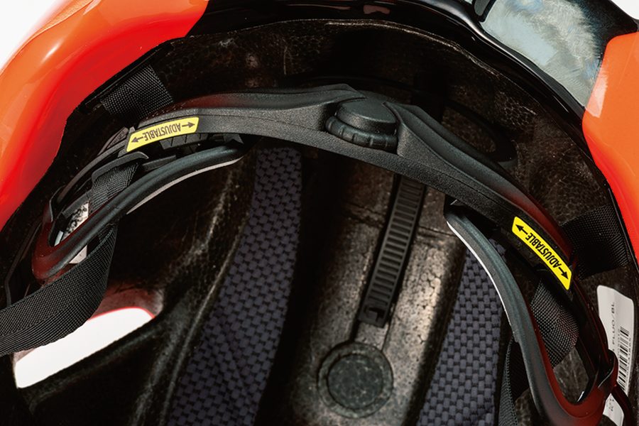 後頭部のアジャスターは2段階の調整が可能。黄色の部分で大まかな頭周のサイズを調整し、中央のダイヤルで締め込み具合を微調整できる。