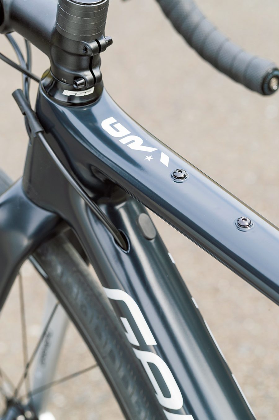 トップチューブにはバッグ取り付け用の台座を設ける。エアボリュームの大きなタイヤを使用しても、ポジションがアップライトになりすぎないようにヘッドチューブは短めの設定。
