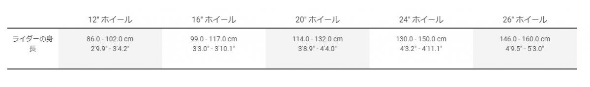 この表は、トレックで用意している身長に基づいた推奨サイズの一覧、最適なフィットのためには手足の長さなどの要素も欠かせない。そのため推奨サイズは重複しているが、同じ身長ライダーでも全員同じサイズのバイクにフィットするわけではない。