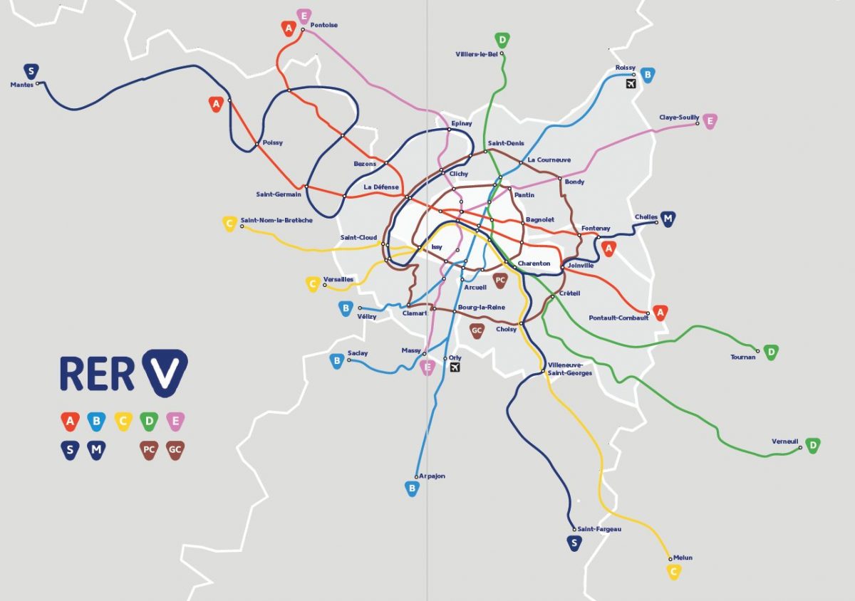 この名称のとおり、「RER-V」のネットワーク網は、本家電車版「RER」の主要路線(AからE)に沿って引かれています。