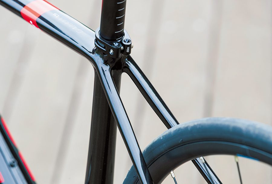 トップチューブからシートステー、シートチューブの上部を細身としたコンフォートゾーンにより快適性を演出する。28Cまでのタイヤに対応したクリアランスを確保した。