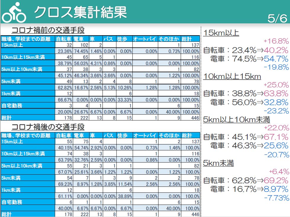 今回の調査はあくまでも自転車愛好家中心のデータで、平成20年の東京都市圏パーソントリップ調査によると東京都市圏の自転車の代表交通手段分担率は14%となっていることと比較しても、一般的な数値に比べて通勤、通学での自転車利用率が高くなってしまっている。ただし、愛好家のなかでもいままで自転車通勤をしてこなかった5㎞以上の中距離層が、3密の通勤電車を回避するために自転車通勤にシフトする割合は増えることは言える。