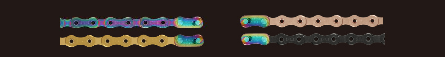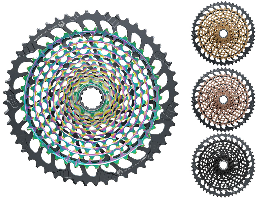 カセット、チェーンにレインボー、ゴールド、カッパー、ブラックの4カラーが用意されている。今回アップデートされたカセット、チェーンは、12スピードのEAGLEシリーズであればどのグレード共通して使用できるのでカラーコーディネートも楽しむことができる