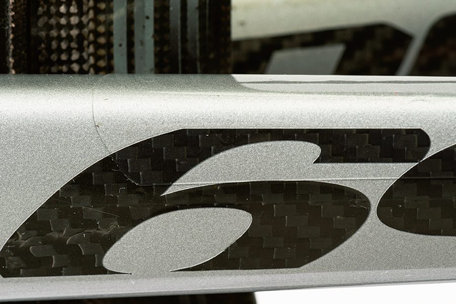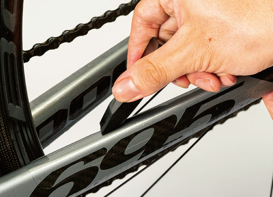 施工液なんてものが付いてくると「なんか難しそう」と思うかもしれないが、接着後すぐならやり直しもできるため、まったく問題なし。シートは薄く、わずかに伸び、なによりクリアで目立たない。とくに透明度が高く、保護シール系にありがちな白っぽさがないのがいい。貼った後、キズや汚れを寄せ付けないのは当然だが、自己修復機能の強靭さがありがたい。マイナスドライバーでフレームを軽く突いてみたが、とりあえず大丈夫そう(笑)。ヘッド部分のアウターワイヤー擦れにはフィルムを小さくカットして対応。フィルム自体が黄ばみや劣化を防ぐため、長期的な使用にも安心感がある。
