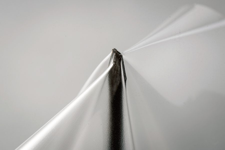 注目すべきはその多彩な機能だ。光沢性、はっ水性、キズ・汚れ防止機能、UVカット機能、發油・耐溶剤性能、常温自己修復機能と多岐にわたる。とくに最後の「常温自己修復機能」はその名のとおり、フィルム自体が自己修復する機能をもっているため、細かな傷の発生を防ぐというもの。