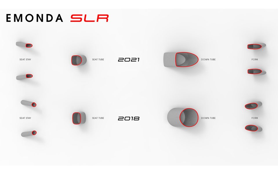 ハイエンドのエモンダSLRと同様のフレーム形状を採用したミドルグレード、エモンダSLも同時開発された。前回のモデルチェンジはSLRのみであったことから、SLのフルモデルチェンジはじつに6年ぶりになる。フレーム素材に500シリーズOCLVカーボンを採用することでコストダウンを実現した。
