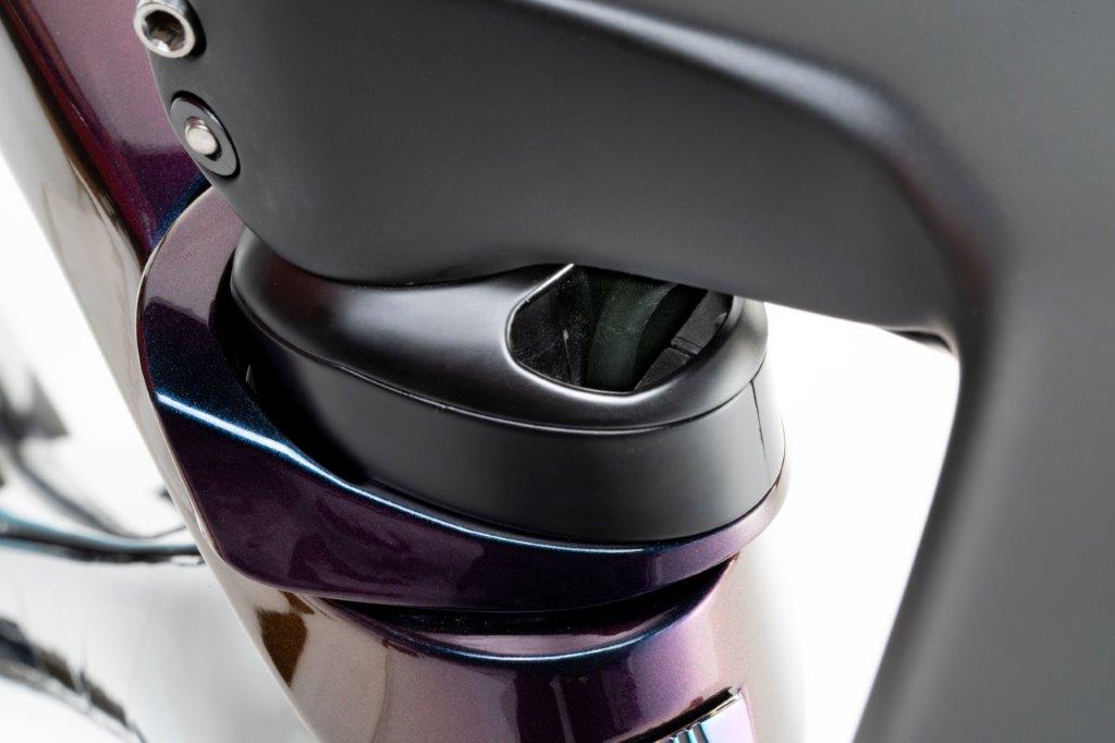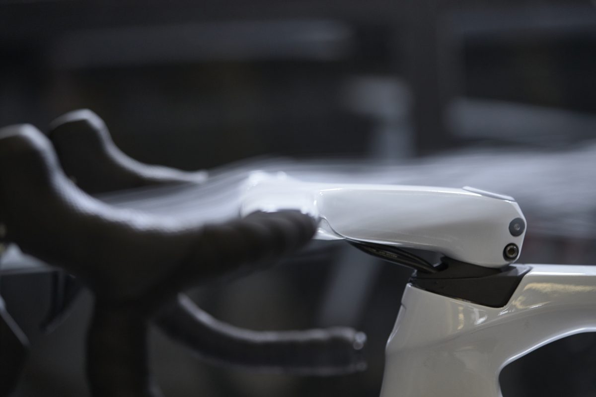 ケーブル類はステム下部でわずかに露出するのみ。完全内装との空気抵抗の差はごくわずかでありながら、優れたメンテナンス性を確保している。これにより通常のステムやハンドルバーも使用可能で、多様なライダーのあらゆるニーズに対応できる