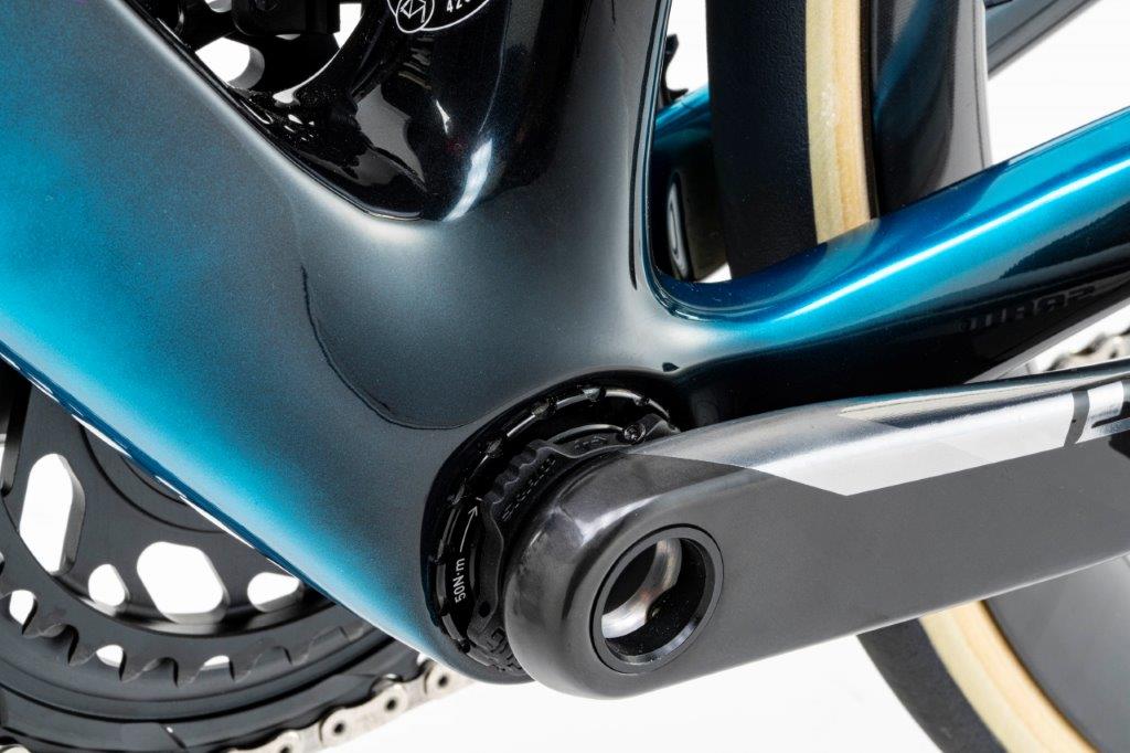 BBは昨年モデルチェンジしたドマーネにも採用されたT47規格を使用する。クリスキングらによって開発されたこの規格は、圧入式ではなくねじ切り式で整備性に優れるのが特徴。BBシェル幅も85.5㎜が確保されていることで、大径チューブのカーボンフレームにもマッチした規格だ。ワイドなスタンス幅によりペダリング効率にも優れる。