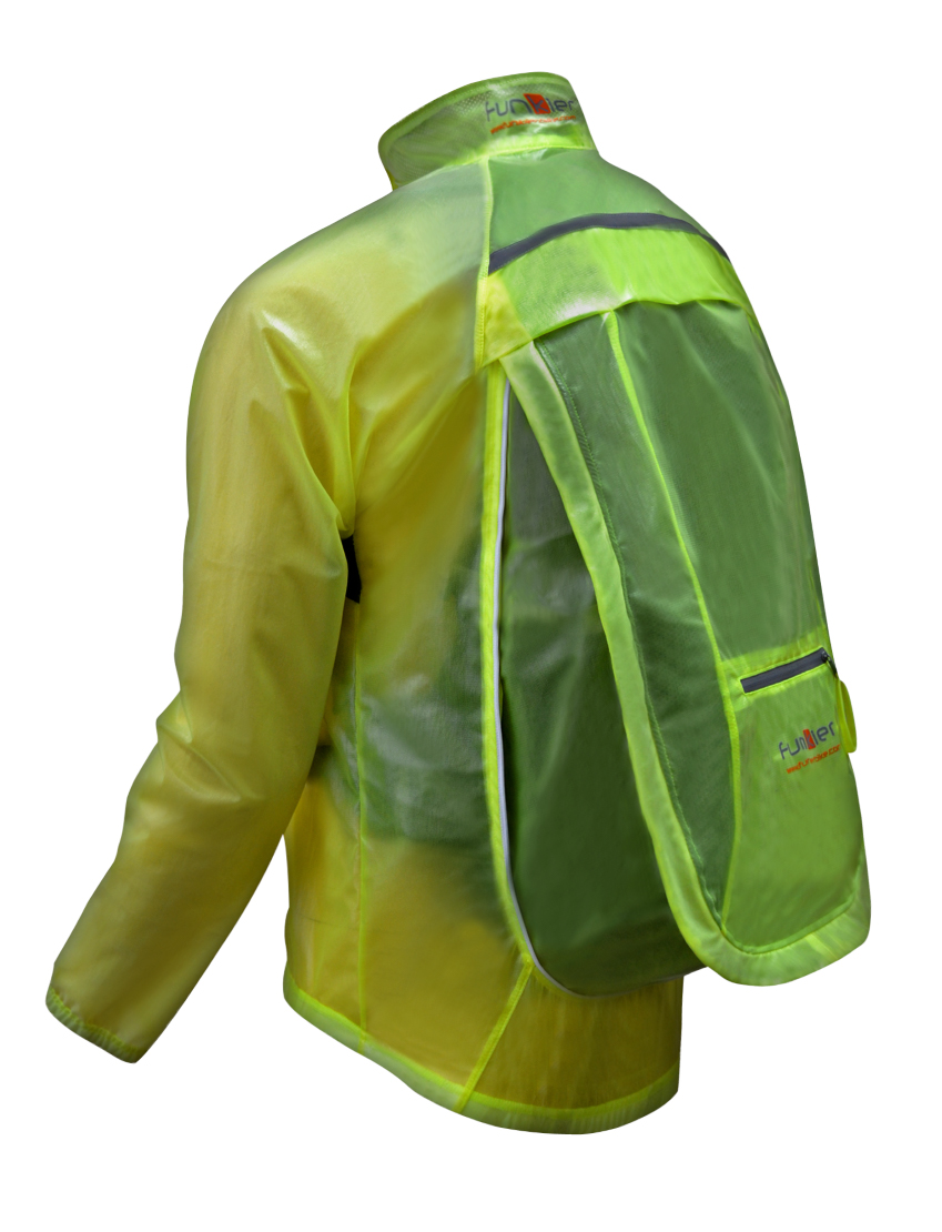 バックパックまでスッポリと納めるレインジャケットで、バックパックがない状態ではジッパーを閉じて普通のレインジャケットとしても使用できる。また、軽量防風・防水生地を使いながら、一部に再帰性反射素材を使っているので夜でも安心だ。さらに蒸れを防ぐベンチレーションホールを装備している。