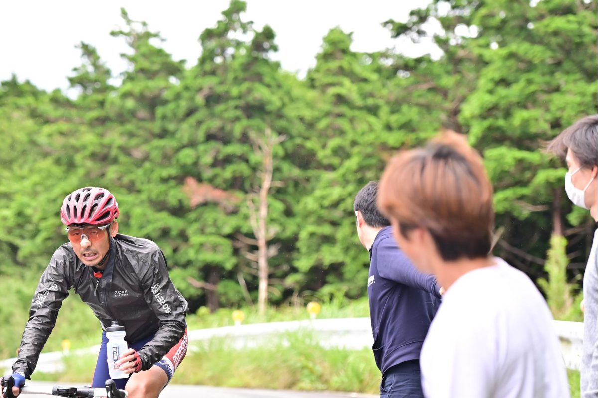 スタッフは峠の頂上で、待機していたが、風雨の強いタフなコンディションで、風でクルマが揺れるほど横殴りの雨の中が降りっぱなしの悪条件だった。前半は、ビオレーサー製のワンピースだけで走っていたが、中盤以降はウインドウブレーカーを羽織ることになった。