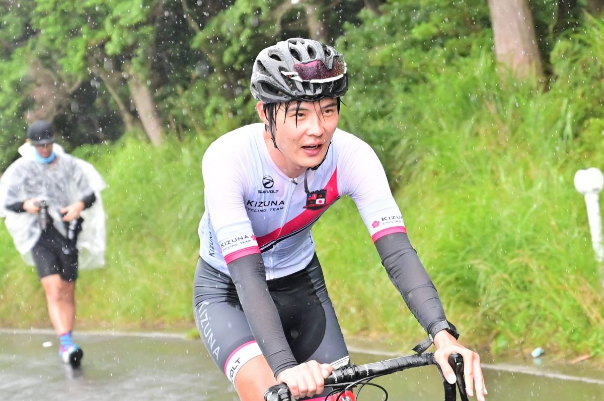 写真は田中裕士さん。「普通に270Wで踏んだけど高岡さんには追いつけなかったです。寒さに加えて、足の関節が痛くなってしまいリタイヤしてしまいましたが、楽しかったので次回はリベンジしたいですね。今回、唯一のリムブレーキバイクでの参加でしたが、8000m分下ることを考えるとディスクブレーキが有利だと思いました」とコメント