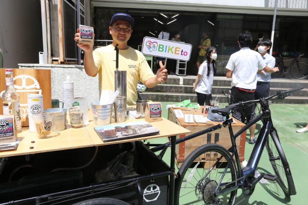 アイスコーヒーを提供したBICYCLE COFFEEの成田裕作さん。今回は金町から渋谷までスペシャライズドのe-BIKE、VADO SLでキャリアカーを引いてきた。普段もVADO SLでコーヒーを配達をする。https://www.sun-west.co.jp/bicyclecoffee
