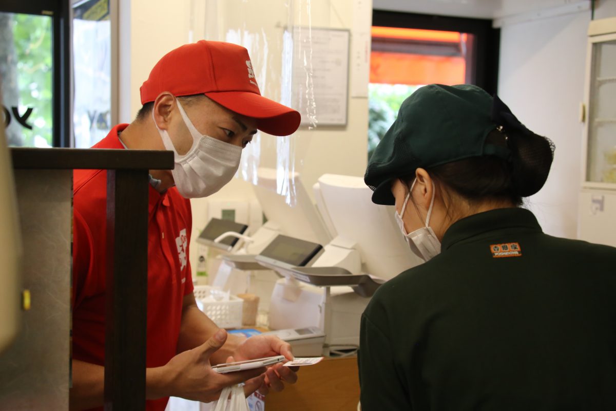 当日はあいにくの天気だったが、指導員の見守るなか、実際のお客様からのオーダーを受け、店舗での受けた渡し、さらにデリバリーを体験した。