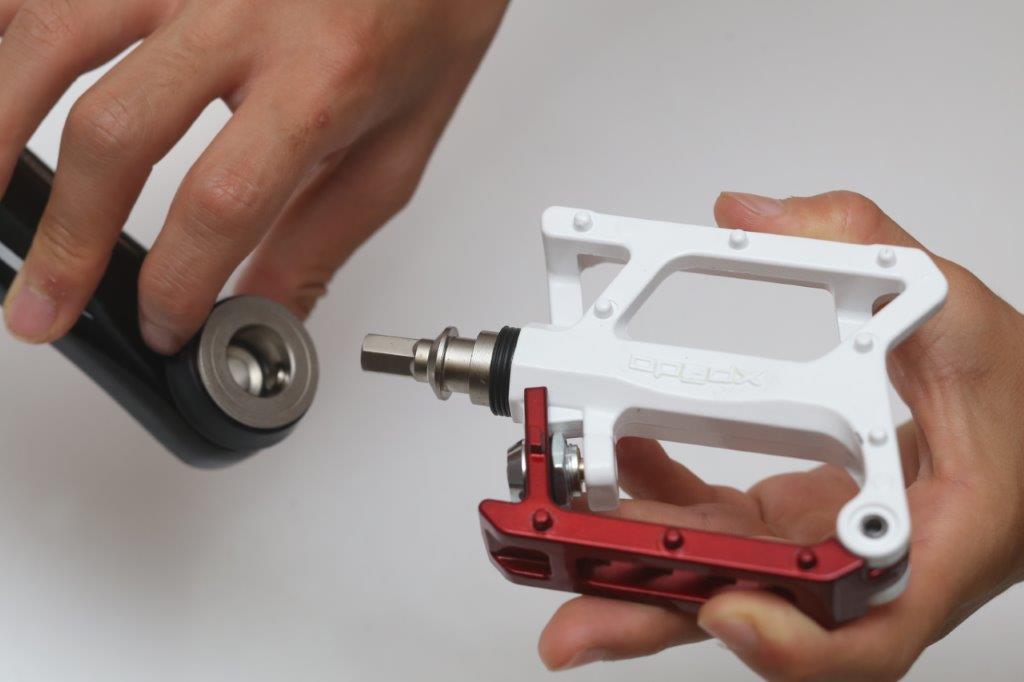 ロックスターはクランクからペダル軸が簡単に外せる仕組みになっているので、ワンタッチで取り外し、鍵を使ってロックを開けて固定するだけだ。取り付けはクランクにセーフティーリングとガスケットを取り付けるだけ。8㎜の六角レンチで作業できるが、取り付けはショップでお願いすれば安心だ。