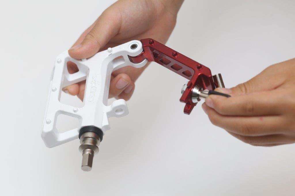 セーフティリングを横に押すとロック軸を固定しているピンが動き、ペダルが外れる仕組み。付属するワッシャーでロックする位置を変えることができる。