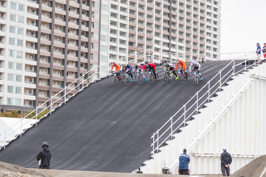 選手村からも近いウォーターフロント、東京都江東区有明北地区に作られた会場は、BMX2種目のほかスケートボードも実施される、アーバンスポーツの中心となる会場。BMXレーシングは8mの高さの「スタートヒル」が設けられ、一気に駆け下りると最高速度は約60kmに達する。