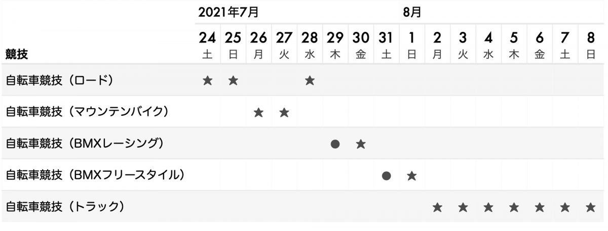 自転車競技は開会式の翌日の7月24日から、閉会式当日の8月8日まで、毎日いずれかの種目が実施される。最も長く行われるのはトラック種目で、自転車競技全22種目のうち12種目が後半7日間を使って行われる。