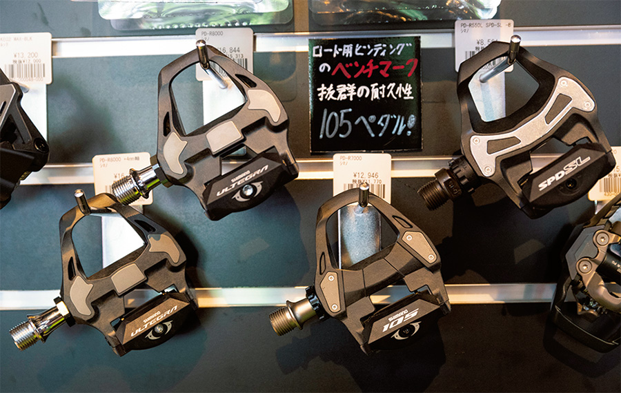 ペダリングの力を効率よく伝達できるシューズとペダルへの交換は3万円程度からできるアップグレードだ。ポイントはシューズのソールで自分の脚力に合った硬さを選びたい。さらに前提としてまず足に合っているものを選ぶこと。幅広であればワイドサイズを必ず選択したい