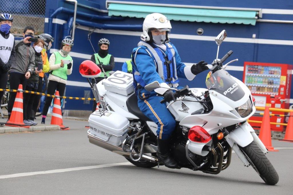 箱根駅伝での先導経験を持つ野口巡査によるデモンストレーションが行われた。