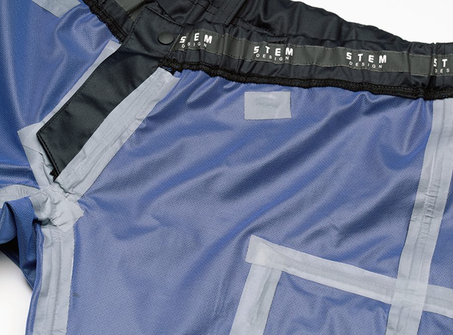 裏返すと、しっかりシームテープで浸水を防いでいるのがわかる。お尻は縫い目のない仕様になっていて、ライド時の違和感なし。