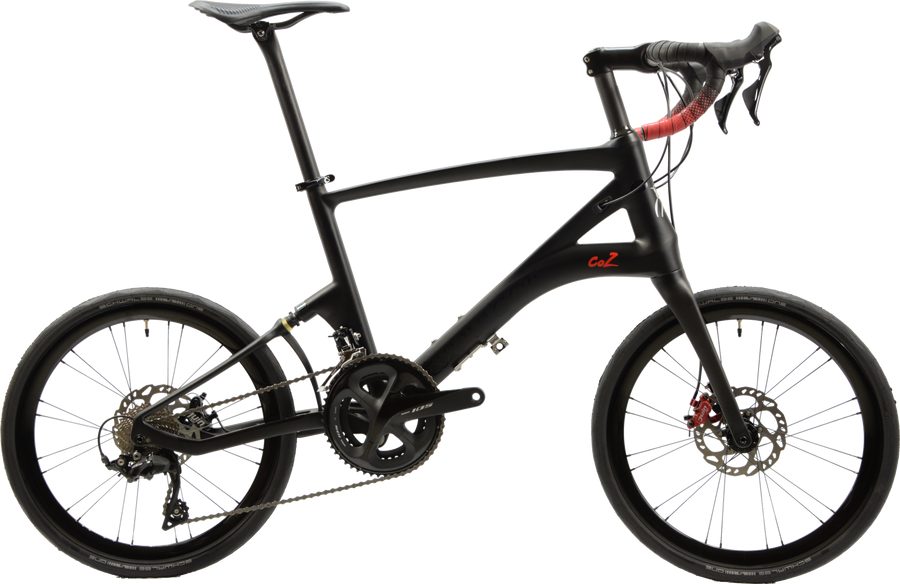 2020 年初秋、カーボンフレームで 6kg 台の超軽量と圧倒的な走行性能を実現した小径ロードバイク『CARACLE-COZ』が大幅に拡充! 最大の目玉はディスクブレーキモデルの登場。単なるディスク化ではなく、フラットマウントとスルーアクスルという最新ロード規格を採用。両方搭載した折りたたみ自転車は、世界初です(弊社調べ)。Juin TECH 製ハイブリッドディスクブレーキは、油圧化キャリパーで、高速ダウンヒルや雨天時も強力なストッピングパワーを発揮。レバーまでの経路はメカニカルワイヤーを使用するので、折りたたみによりブレーキ経路が倒立してもエアー噛みによる制動不良が生じる心配がありません。また、スルーアクスル機構によりハブの回転性能を 100%引き出す