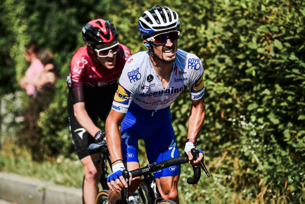 1級山岳コロンビエール峠を前に、暫定リーダーのピノを含む先頭グループはマルティネス、アラフィリップ、クス、デラクルス、マルタンら24人となった。コロンビエール峠の山頂まで残り3kmの地点でパヴェル・シヴァコフ(チームイネオス)とアラフィリップがアタック。集団ではセバスティアン・ライヒェンバッハ(グルパマFDJ)が中心に2人との差を1分以内にコントロールしながら様子をうかがった。個人総合暫定3位に付けるミケル・ランダ(バーレーン・マクラーレン)は83km地点で先頭集団から3分55秒差と苦戦しており、総合リーダー争いから脱落した。
