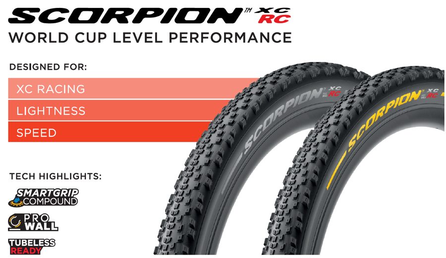 すべてのモデルがドライでもウェットでも路面コンディション問わず、優れたグリップ力を発揮する、「SMARTGRIP COMPOUND」を採用することで、路面状況や天候を気にすることなく使用することが可能なチューブレス・レディタイヤ SCORPION™シリーズに、低転がり抵抗とグリップ力、軽量性を兼ね備えたワールドカップレベルのレーシングスペックタイヤ「SCORPION™XC RC」が登場。