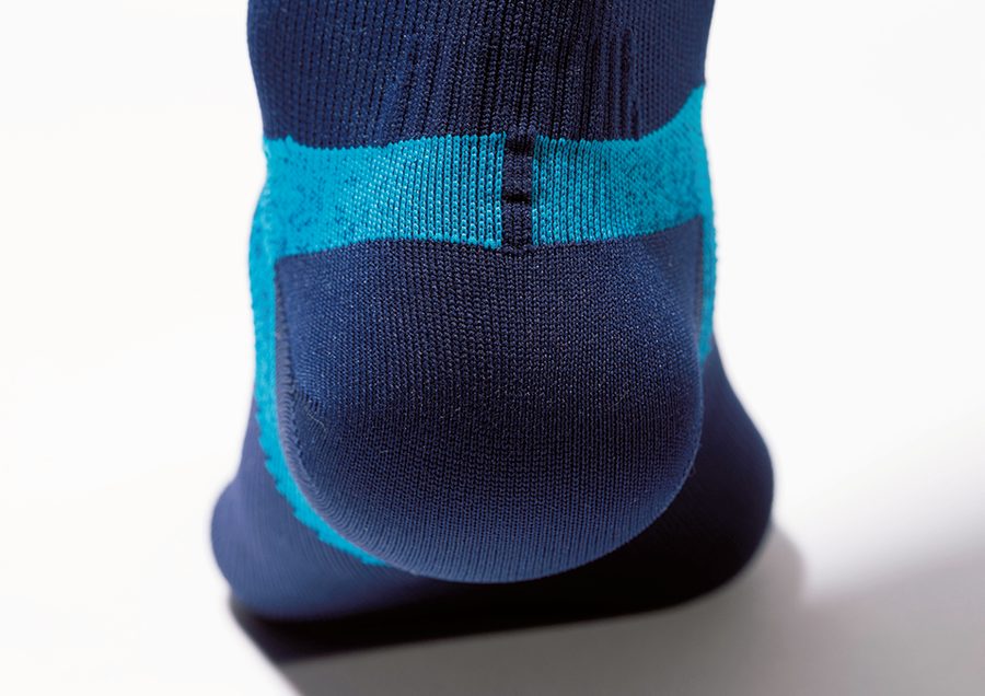 数カ月前に発売された「ヒールロックソックス」は、あるサポート選手からのリクエストに応える形で開発がスタートした一品。整骨院の医師との試行錯誤を繰り返して設計され、カカト部分に細く薄いテーピングを施すような設計になっている。