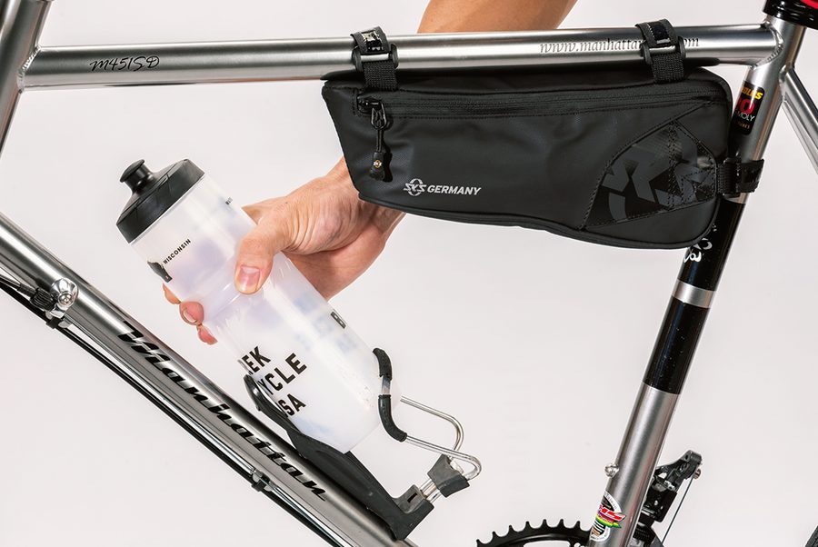 一般的なフレームバッグだと、ボトルを抜き出すときにバッグと接触してしまうが……。このとおり!