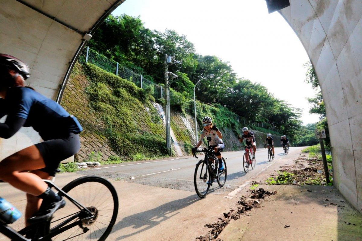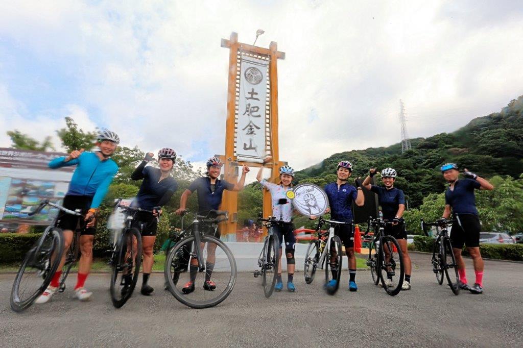 今回のツアーでは、右から左へカケルバイク代表の小野剣人さん、富士ヒルクライム優勝者榎本美帆さん、シクロクロス元日本チャンピオン宮内佐季子さん、メリダXベース品川真寛さん、tom’s cyclingのお2人(TOMIさん、YOPIさん)、蠣崎藍道さん。さらに本誌山口というメンバーで走った。