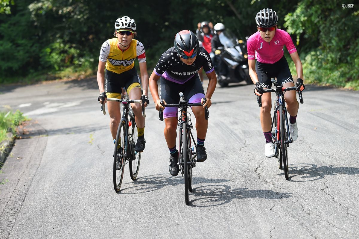 レース終盤、渡部春雅(駒沢大学高等学校)、唐見実世子(弱虫ペダルサイクリングチーム)、樫木祥子(株式会社オーエンス)の3名となった集団