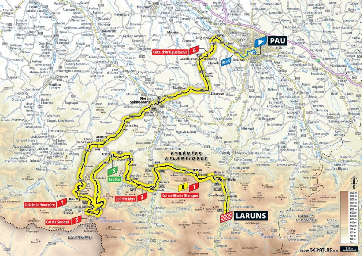 ピレネー山岳ステージ2日目となる第9ステージは、5つのカテゴリー山岳が登場。スタートからわずか9.5kmで4級山岳アルティーグルヴ峠(距離2.3km、平均勾配4.5%)が現れ、しばらく平坦基調のコースを進んだあと、およそ70km地点に1級山岳ラ・ウルセル峠(距離11.1km、平均勾配8.8%)、続いて3級山岳スデ峠(距離3.8km、平均勾配8.5%)とカテゴリー山岳が連続。スプリントポイントを経て3級山岳イシェール峠(距離4.2km、平均勾配7%)、最後にボーナスポイントのかかった1級山岳マリーブランク峠(距離7.7km、平均勾配8.6%)を越えてフィニッシュとなる。