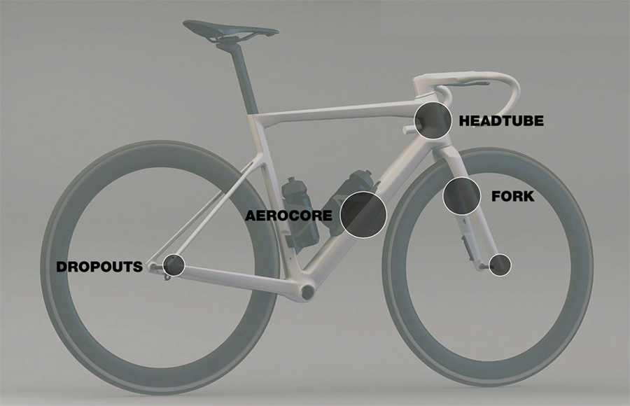 独自の高度なコンピューターシミュレーションによりフレームの理想数値を導くBMCのエーステクノロジー。剛性、重量、快適性の3要素に加え、第4世代では空力性能を加えた「エースプラス」テクノロジーにてリファインされた。フレーム重量820g、フォーク重量345gに仕上がっている。