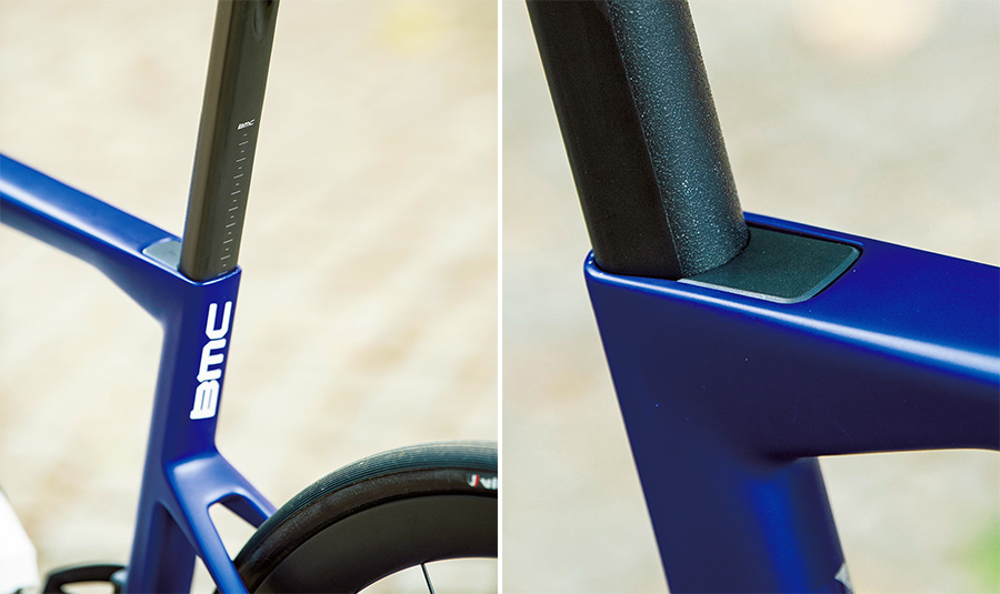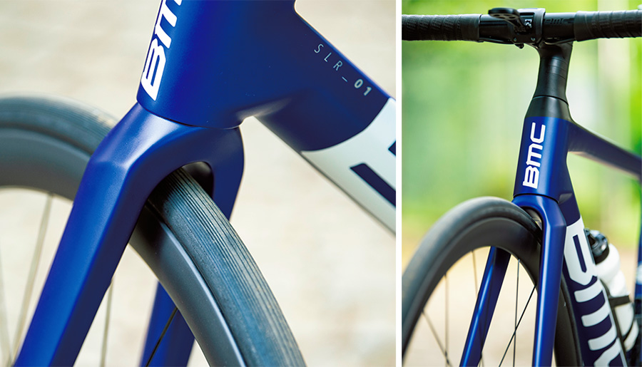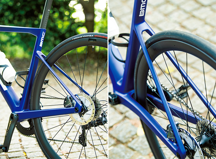 ところが、そんな思いは焼けるような真夏のアスファルトへと走り出した瞬間に消え失せていった。ペダルにパワーをかけていくとトラクションのかかりが鋭く、リアのドロップドシートステーが小気味よく働き出す。近年、空力性能の優位性からもドロップド・シートステーは各社のトレンドであるが、BMCは10年前の初代S L R01からこの形状を特徴としてきた。