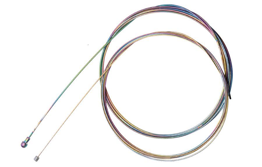 知る人ぞ知る日泉ケーブルのSP31。通常のインナーケーブルは、19本の素線からなるが、これは31本の素線を使用。それを高密度でより、さらに真円に近づけるスリック加工をしてコーティング。驚くべき低摩擦を実現している。SP31は愛車にも使っているが、引きの軽さが長期に持続し、かつ伸びない。知るかぎりベストなケーブルだと思う。限定生産品として登場したこのケーブルは、さらに強固なチタンコーティングを施した上位バージョンだ。チタンコーティングをかけるときの電圧や時間を調整することで、鮮やかな彩りを生み出している。まさに日泉ケーブルが誇るハイパーグレード。究極の一台に、とくに高級チタンバイクのオーナーはこれ一択でしょう!