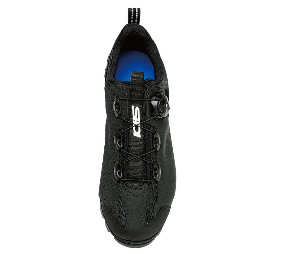ソールを見るとMTB用というだけあってそれなりにワイルドだが、アッパーは黒でシンプル。とにかくカッコいい。上から見たときの「細身感」がサイコー。足幅が狭くて甲が低い人でないとこのシルエットにならないかもしれないけど