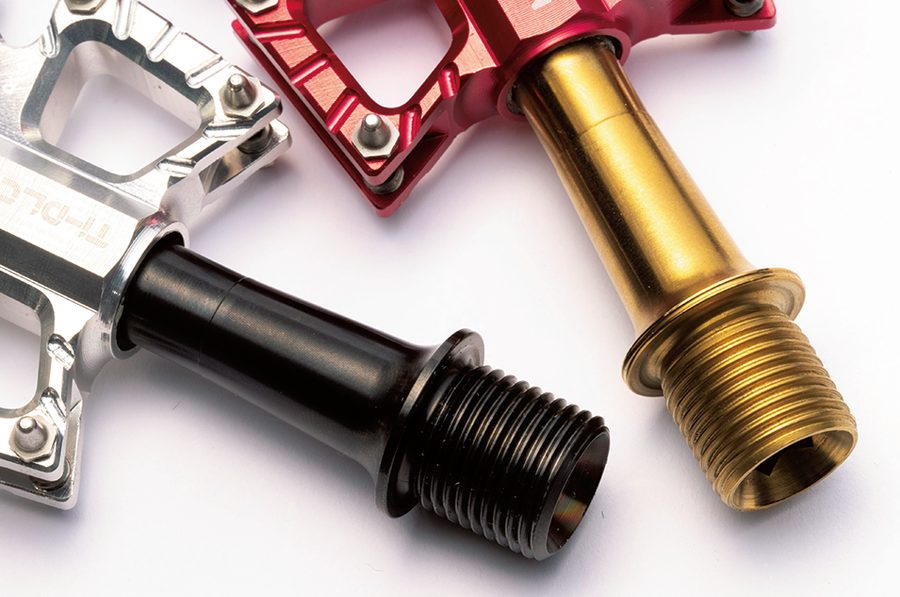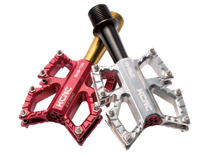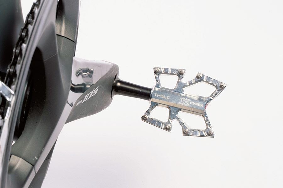 プーリーや各種ボルト、ディスクブレーキローターなどのKCNCパーツのなかから、今回ピックアップしたのが、このフラットペダル。アルミボディーにチタン(あるいはステンレス)を採用した超軽量モデル。