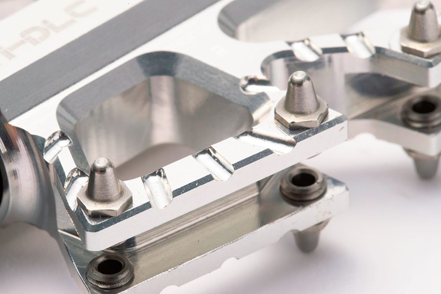 驚くべきはそのコンパクトさ。W58×D50×H15mmというサイズはロードにしろMTBにしろ、かなりスリムだ。さらにボディーは削り出し加工され、極限まで軽量化を実現。しかし片面8つのスパイクピンを採用することでシューズへの食い付きのよさも確保する。