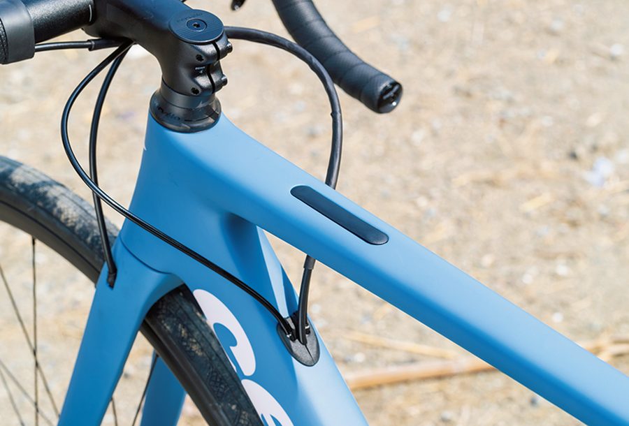 トップチューブ上にはバッグなどを取り付け可能な台座を設けた。ダウンチューブに設けられたケーブルガイドは、DI2へのアップグレード時にジャンクションの設置が可能だ。
