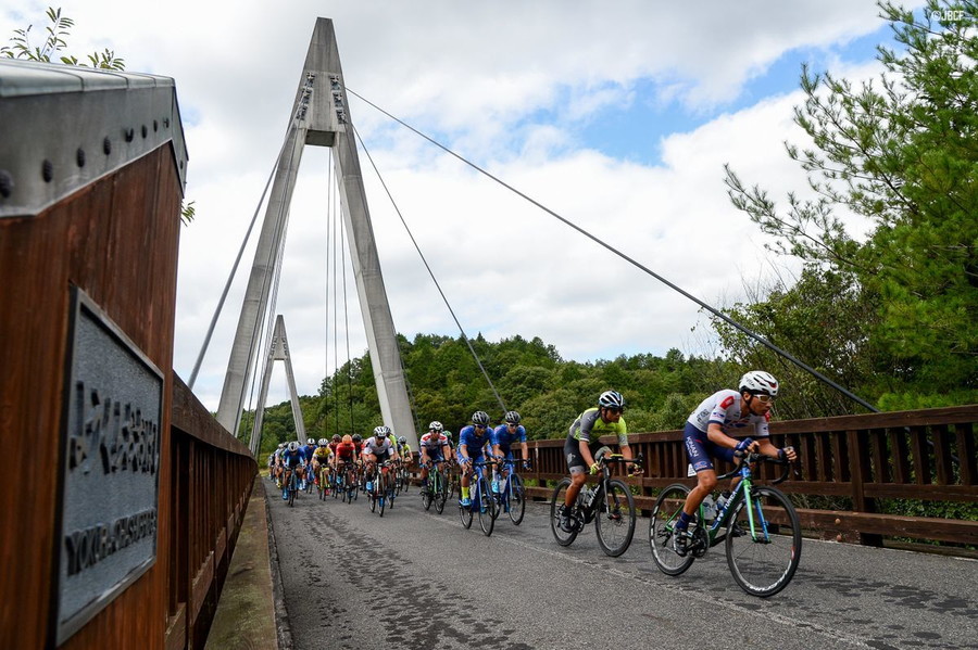 残り1km地点付近にある斜張橋「用倉大橋(ようくらおおはし)」を渡る集団