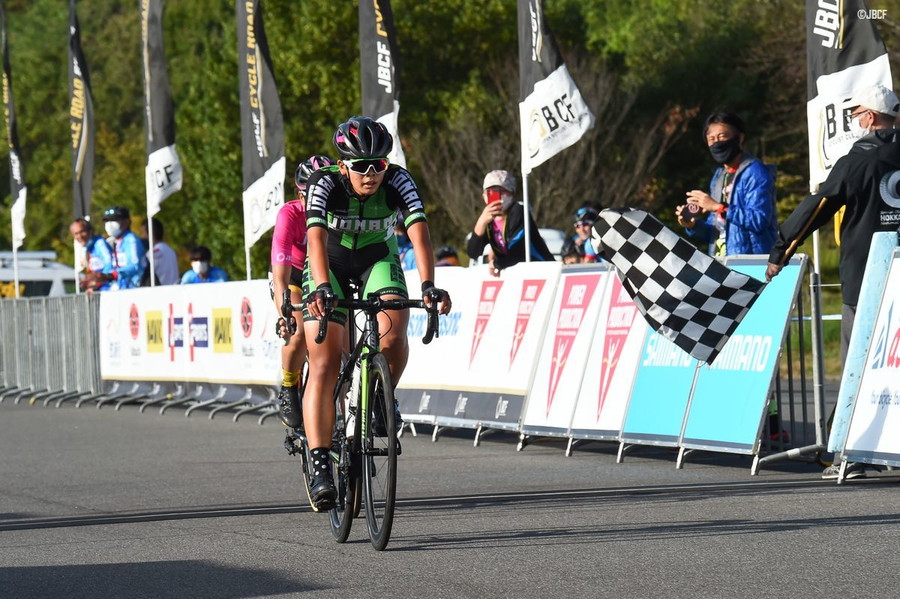 レース後半に入り、渡部が遅れて5人となった先頭集団では樫木が登り区間ごとにアタックしていく。しかし唐見、垣田、大堀が追従し、決定的な動きとならないまま最後のホームストレートへ。先頭で姿を現したのは垣田。唐見がぴたりと後ろにつけるがまくりに行けず、唐見を従えたままま垣田が先着。高校1年生がJフェミニンツアー初優勝を挙げた。