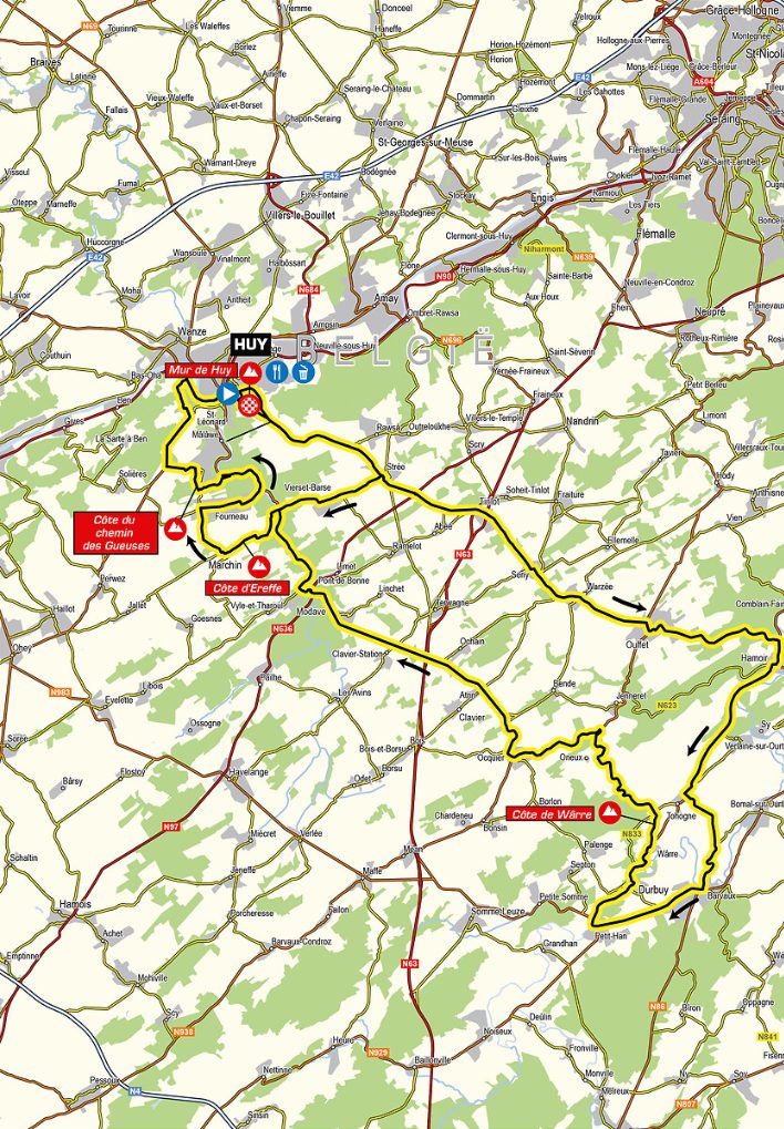 フレーシュ・ワロンヌの今年のコースは、エルヴからミュール・ド・ユイまでの202km。レース後半は最大勾配26%の急勾配の上り“ユイの壁”を含む周回コースを3周して、ユイの壁を上りきったところでフィニッシュとなる。