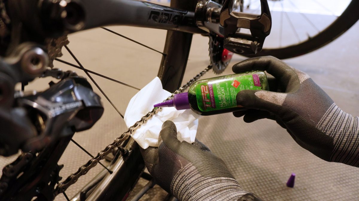 赤間さんはWELDTITE TF2パフォーマンスルブを使用。ウェットコンディションも含め、全天候に対応。テフロン成分により、スムーズな変速性能をもたらす。全天候対応なので耐久性も高く、通勤用自転車には最適な潤滑剤だ。洗浄後のチェーンにはひとコマひとコマ丁寧に潤滑剤を塗布し、プレート部分の余分な油分はウェスで拭きとっておく。