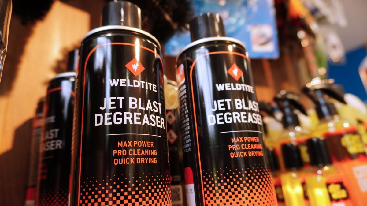 週一回のチェーン洗浄には、「WELDTITE(ウェルドタイト)」のJETBLASTディグリーザースプレーを使用。強力なジェット噴射と濃いディグリーザー成分によって、簡単に素早くチェーンの汚れを落としてくれる。