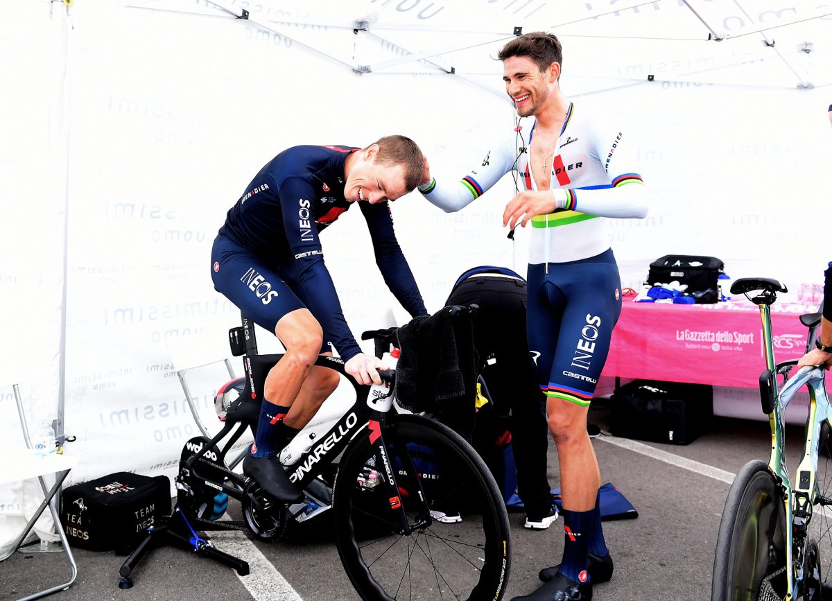 1、2フィニッシュを決めたイネオス・グレナディアスのフィリッポ・ガンナとローハン・デニス。今年と去年の世界チャンピオンだ