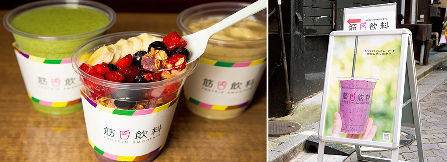 体重が約70kgなら、運動をしなくても必要なタンパク質は70gが目安。運動したときはその倍の140gのタンパク質摂取が目安となる。食事だけでカロリーを抑えながらタンパク質の必要量をとるのは難しい。筋肉飲料代表の安原莞太さんは、低カロリーでおいしいタンパク質を提供しようと、プロテインスムージー専門店をオープンした。プレーン味のプロテインは料理に入れてとってもいいそうだ