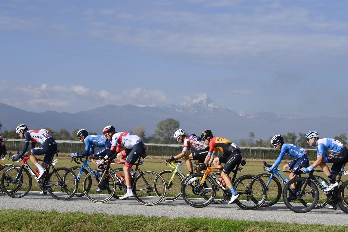 逃げグループでは先頭がめまぐるしく入れ替わった。フィリッポ・フィオレッリ(バルディアーニCSF)がKOMを先頭で通過し、その後の下りでダヴィデ・バッレリーニ(ドゥクーニンク・クイックステップ)が単独で先頭に立ち、しばらく独走。2回目のセストリエーレのKOM付近でエイネルアウグスト・ルビオ(モビスター)がバッレリーニを抜き去って独走に入った。
