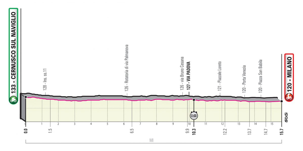 コースはミラノ市内の15.7㎞の平たん路で、最後は大聖堂、ドゥオーモにゴールする。近年ジロ・デ・イタリアの恒例となっているコースとなった。